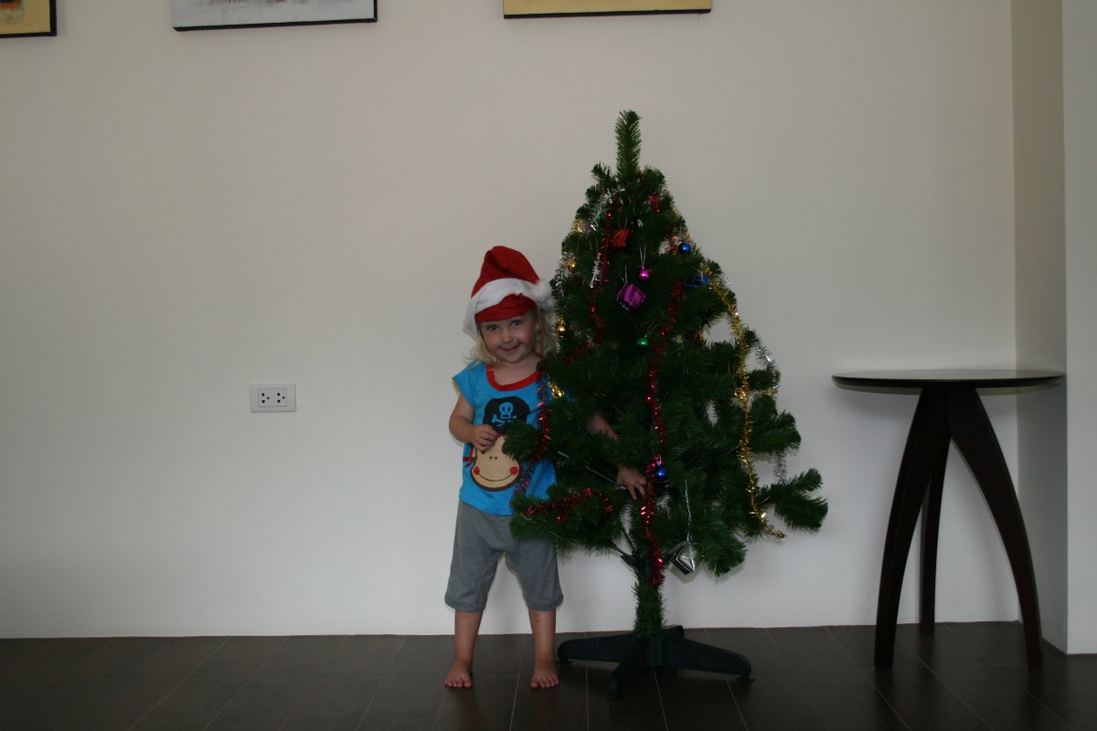 Alex posar med julgranar