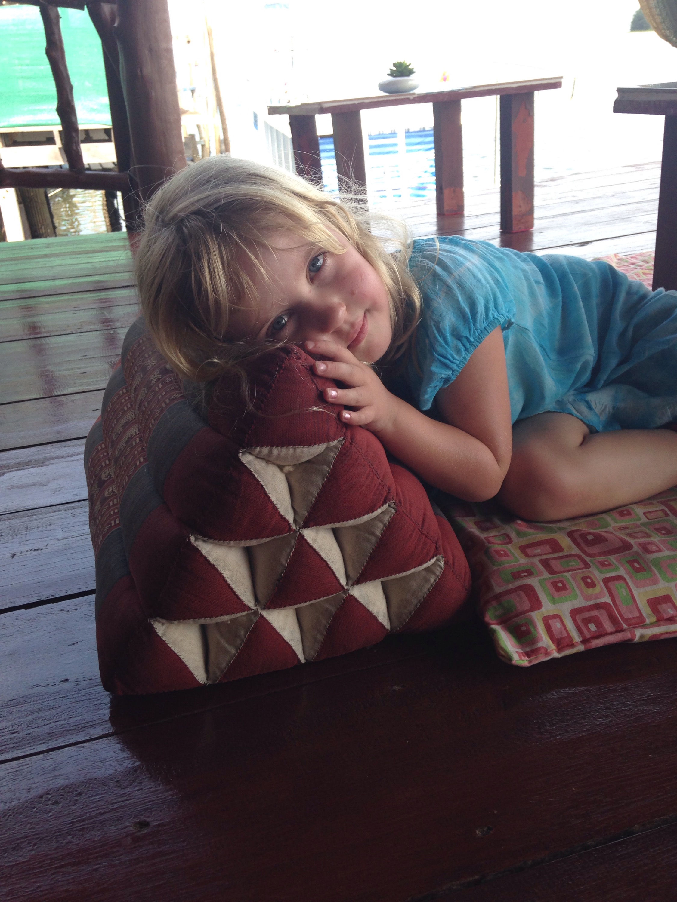 Vi behövde hämta ut mer pengar och köpa lite plåster (Morgan har slagit i båda stortårna så han blöder) så Pappa och Alx tog en tuktuk och åkte in till stan. Väl där så gick vi på lite utflykt och kollade in stranden och gick på ett litet sött hamnkafe där Alx testade att vila som en riktig backpacker på Thaikuddar innan hon åt pannkakor (igen, hon åt det även till frukost 🙂 och pappa drack dyrt ”svenskt” kaffe (troligen en trippel espresso som de kallar svensk…)