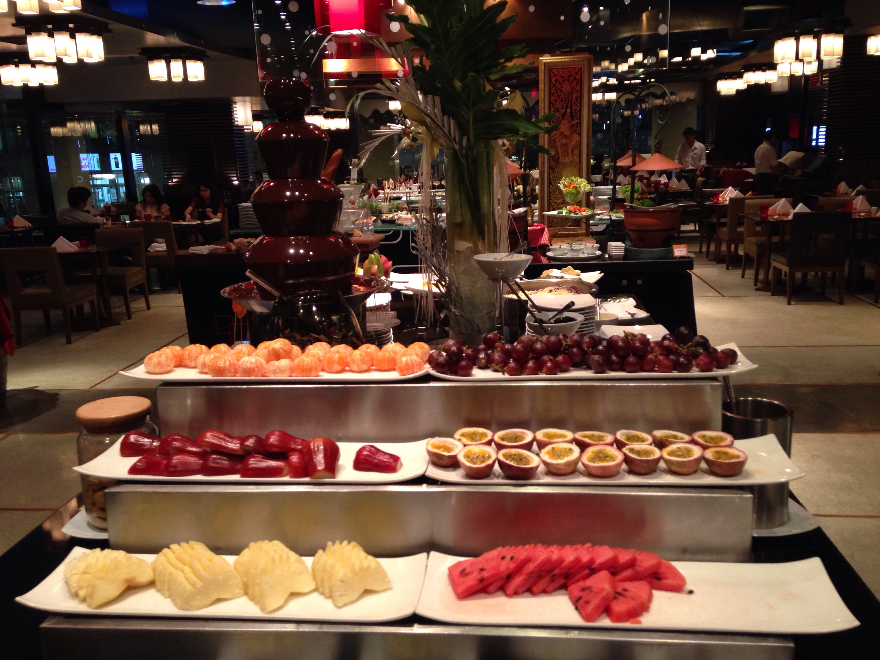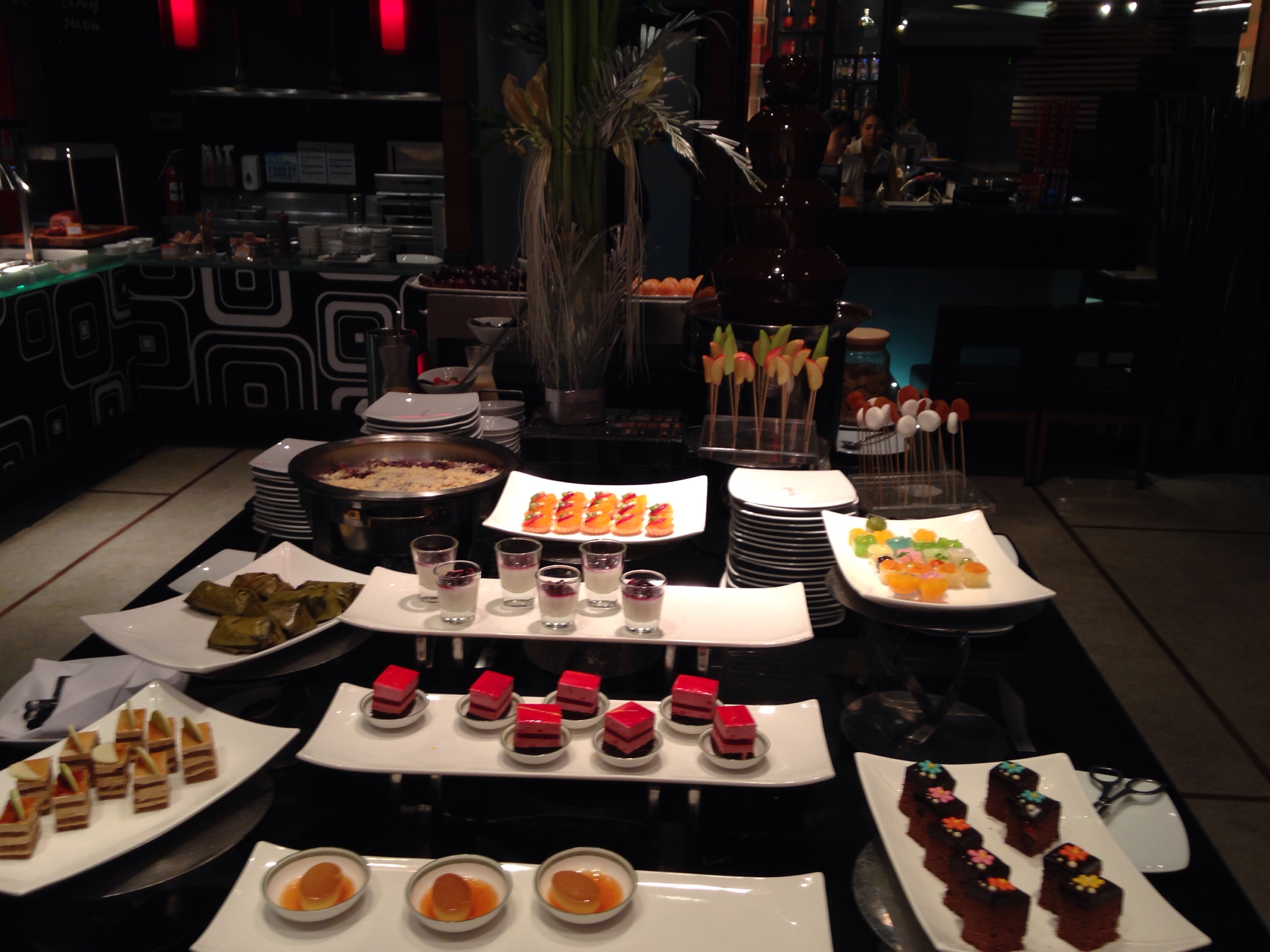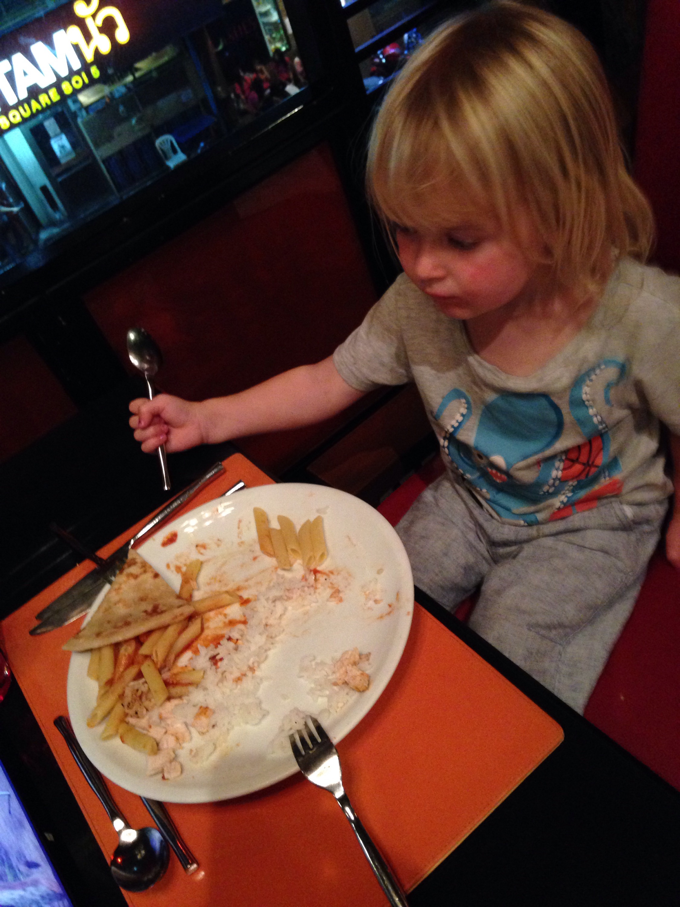Efter en lång dags resa så kom vi fram till Novotel på Siam square. Vi checkade in snabbt och sprang till närmaste restaurangen, dvs hotellets. Utan några förhoppningar förutom att få mat och slippa allt för mycket bråk gick vi för att äta. Vi blev väldigt positivt överraskade. Maten var fantastisk och barnen bråkade nästan inget. De somnade nästan och åt bara pasta, men mamma och pappa fick en underbar middag i alla fall 🙂