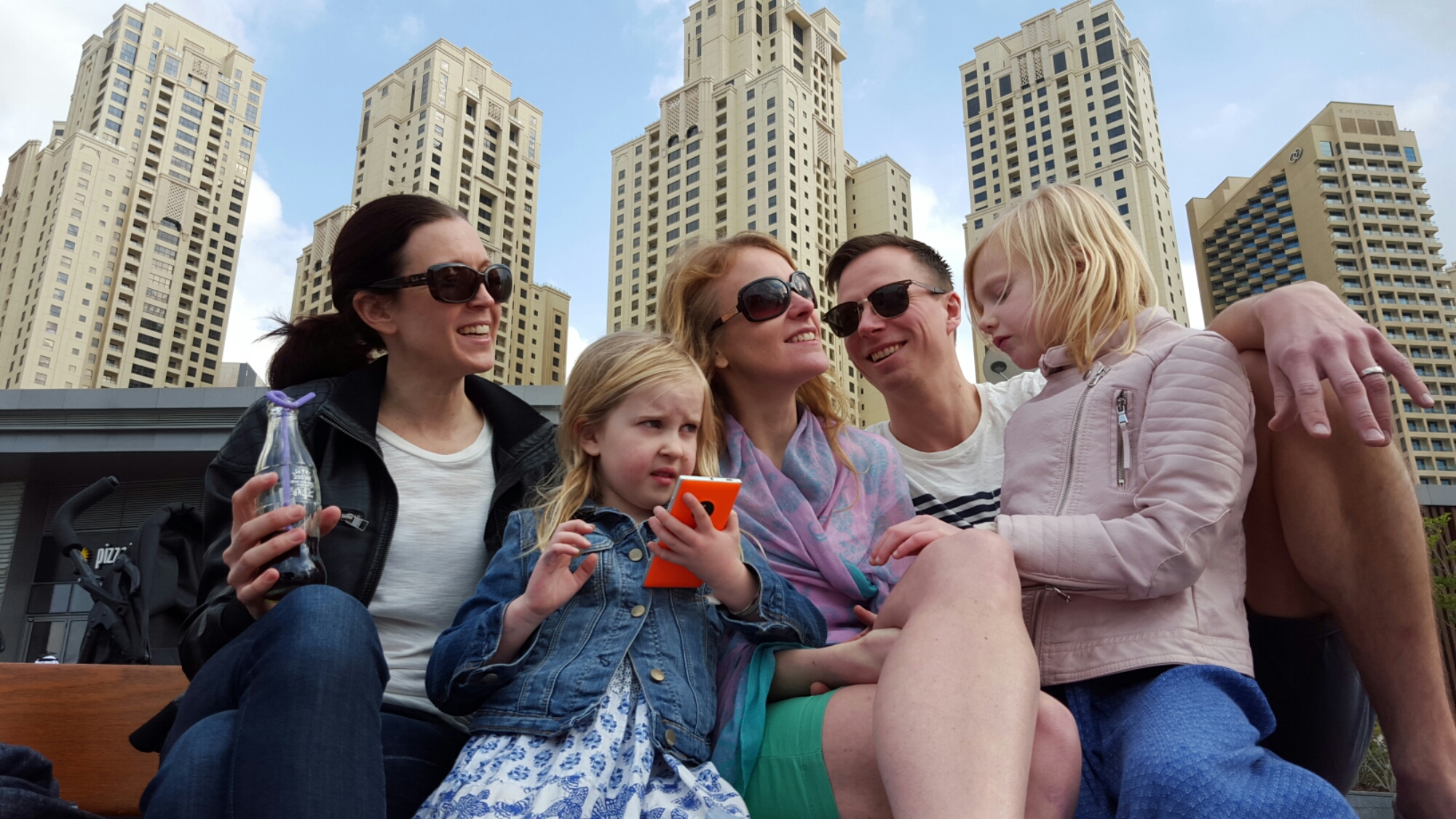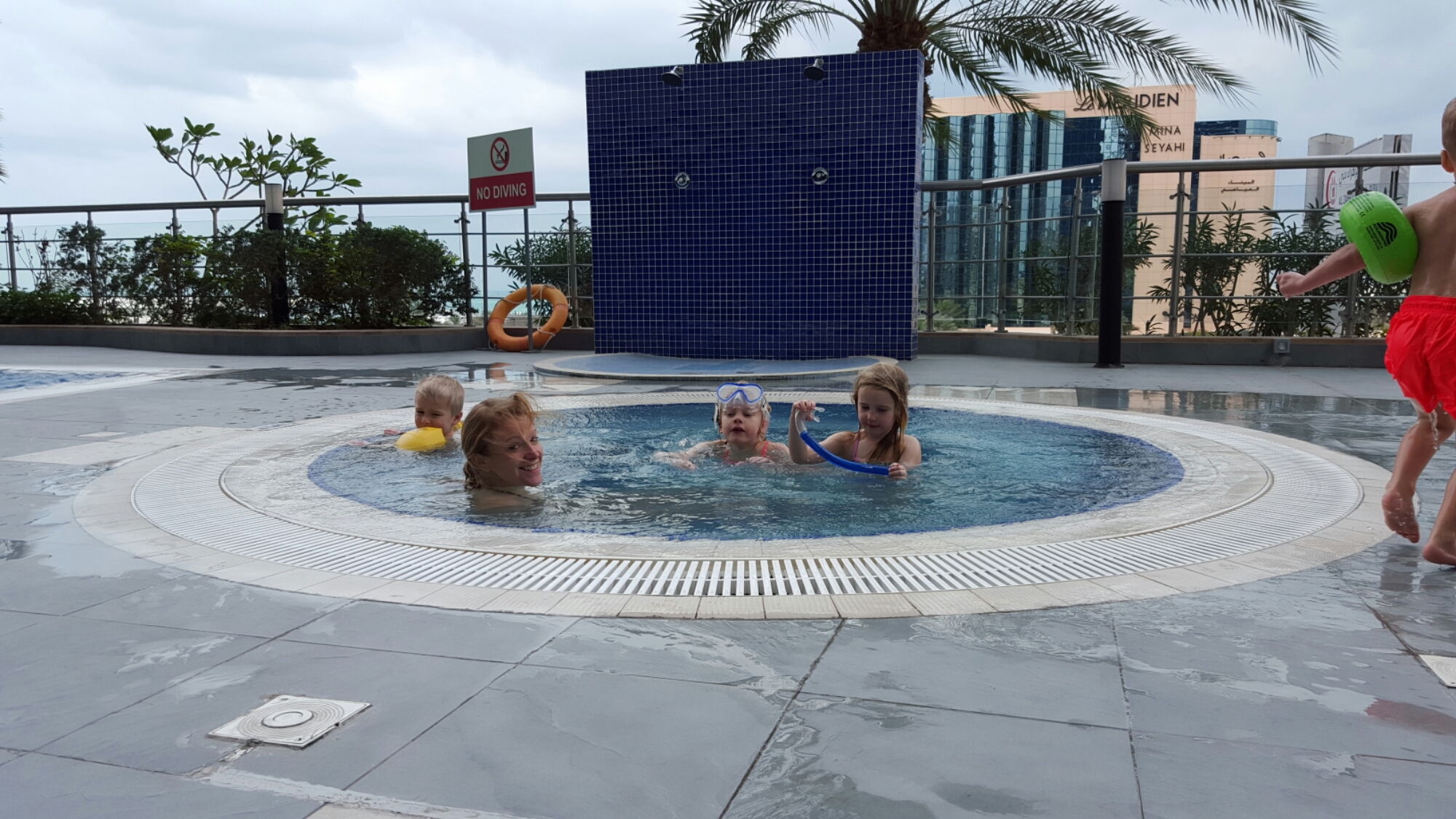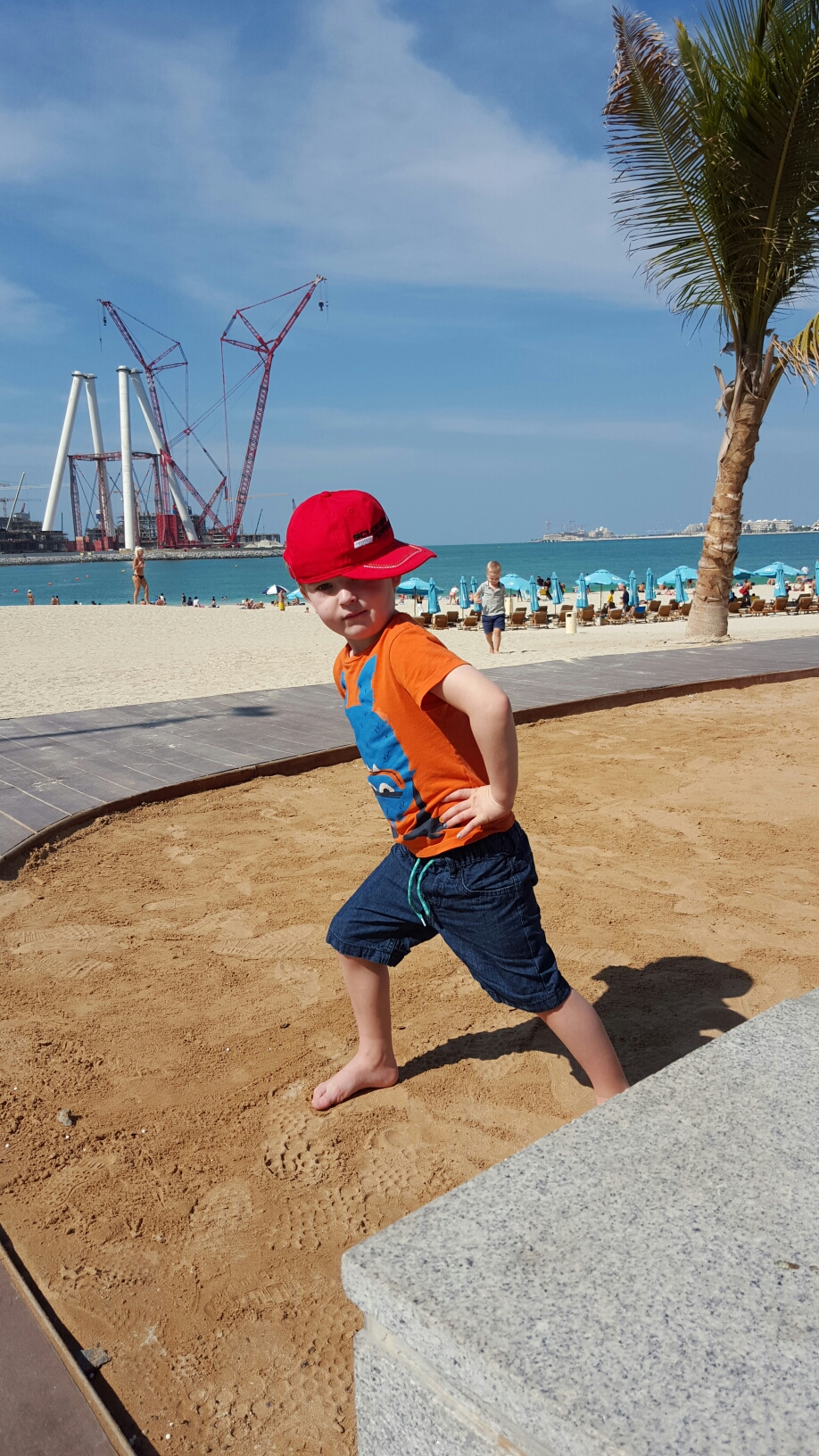 Nu har vi kommit fram till Dubai. Vi har två väldigt fina lägenheter på 29 och 30 våningen i ett höghus vid Dubai Marina. Det var lite kallt och blåsigt dagen vi kom, men som tur är var den lilla poolen uppvärmd och väldigt skön ändå. Idag är det strålande sol och vi är nere på stranden och njuter fullt (fast lite väl kallt i vattnet för oss vuxna i alla fall).