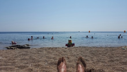 Efter en natt med krävande barn. Båda barnen kräktes, men Alx verkar ha blivit värst drabbad så ligger Alx inne och kollar film medan killarna är på stranden. Morgan verkar helt ok och leker med sina dinosaurier och hajar i vattenbrynet och Pappa kollar på 🙂