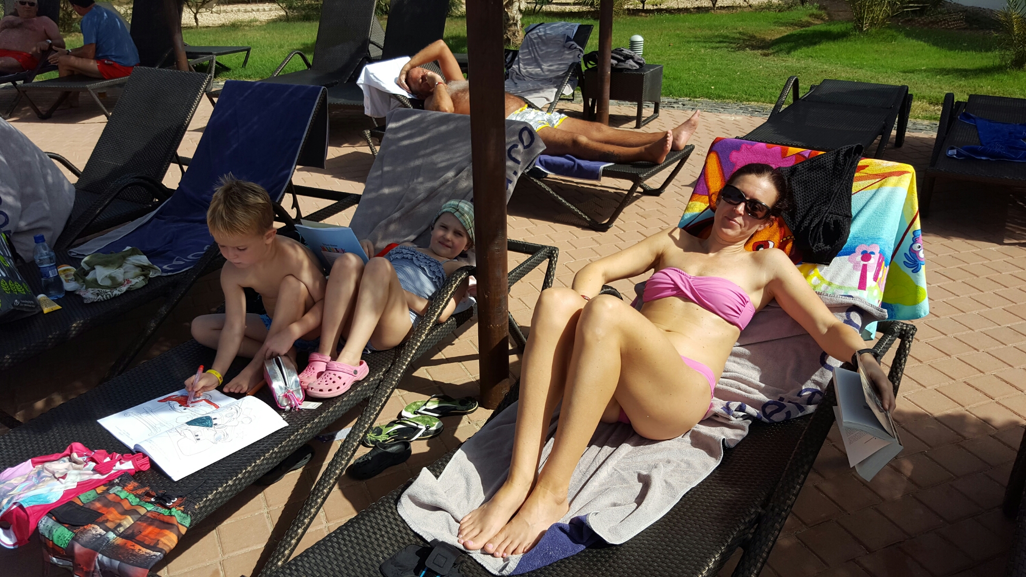 Nu har vi hittat platsen vid poolen där vi kommer njuta under veckan. Pappa sprang en sväng längs stranden och konstaterade att det finns inte så mycket att se eller göra utanför resorten så vi kommer nog spendera mycket tid här. tur att det är trevligt och mycket varmt i luften eftersom poolen inte alls är lila varm som hemma, kanske bara 26 grader 🙂