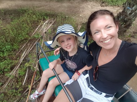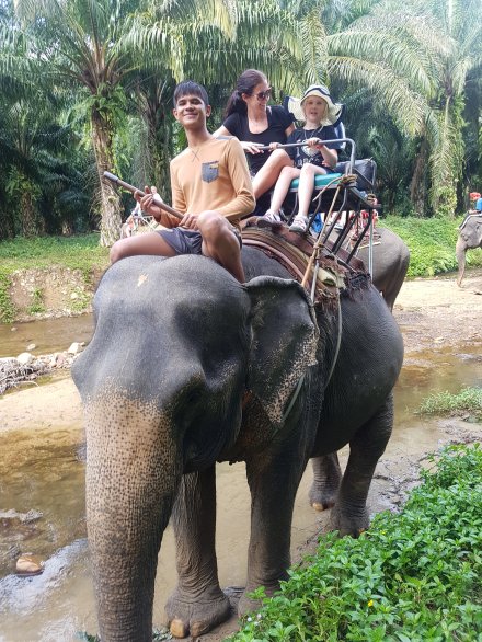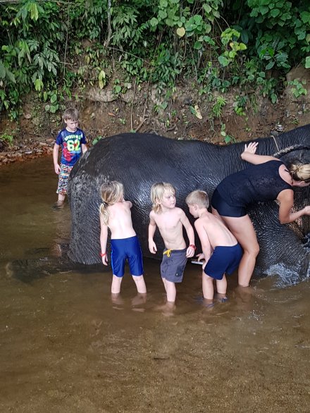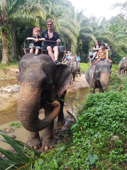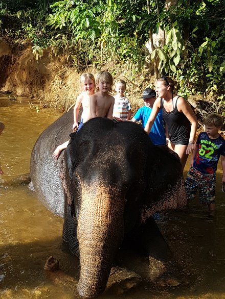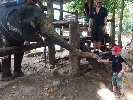 Idag har vi varit och hälsat på Elefanter. Vi fick följa med på en ridtur genom skogen, där vi såg fåglar, fjärilar och massa fina palmer. Lite otäckt är det då man sitter högt upp men elefanterna har otroligt bra koll på var de sätter fötterna. Efter ridturen skulle några av elefanterna bada och barnen fick hjälpa till och skrubba dem. Den minsta är 7år, och redan stor som en stor häst. Matriarken, det största honan och gruppens ledare är 26år och har känt sin skötare sen hon var nyfödd.