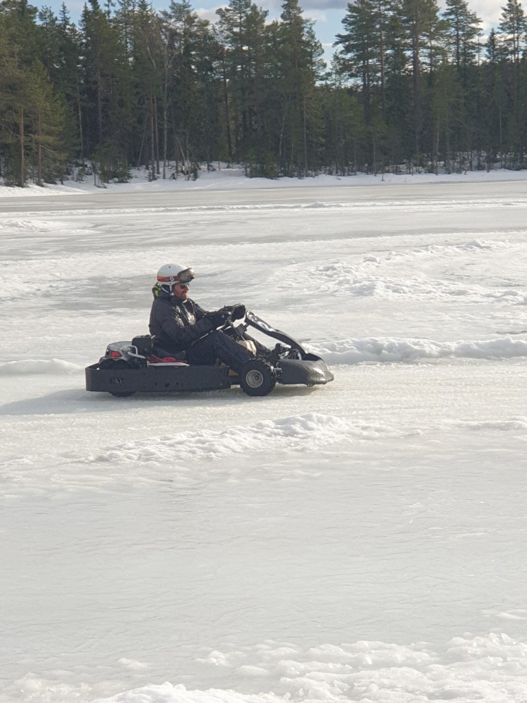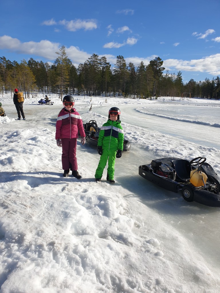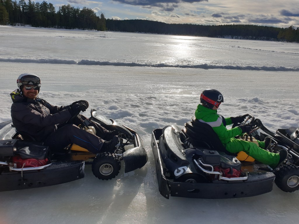 Barnen och pappa fortsatte dagen med roliga aktiviteter. Gokart på is eller som det heter iskarting! Helt fantastiskt kul att drifta runt på banan och försöka ta sig runt svängarna utan att spinna runt. Strålande solsken, varmt och rätt blött när däcken sprutar snö och is runt omkring. Barnen körde även lite skoter på en bana bredvid. Vi är alla överens om att detta är en helt fantastisk aktivitet 😀