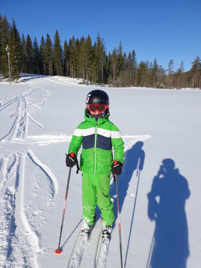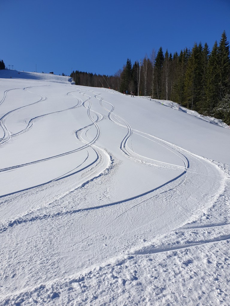 Riktigt härlig start på dagen efter att det kommit lite nysnö under natten. Vi fick tre åk innan det kom några andra i Norrbacken och hann lägga några åttor. Pappa önnar, Morgan stänger. Magiskt 😀