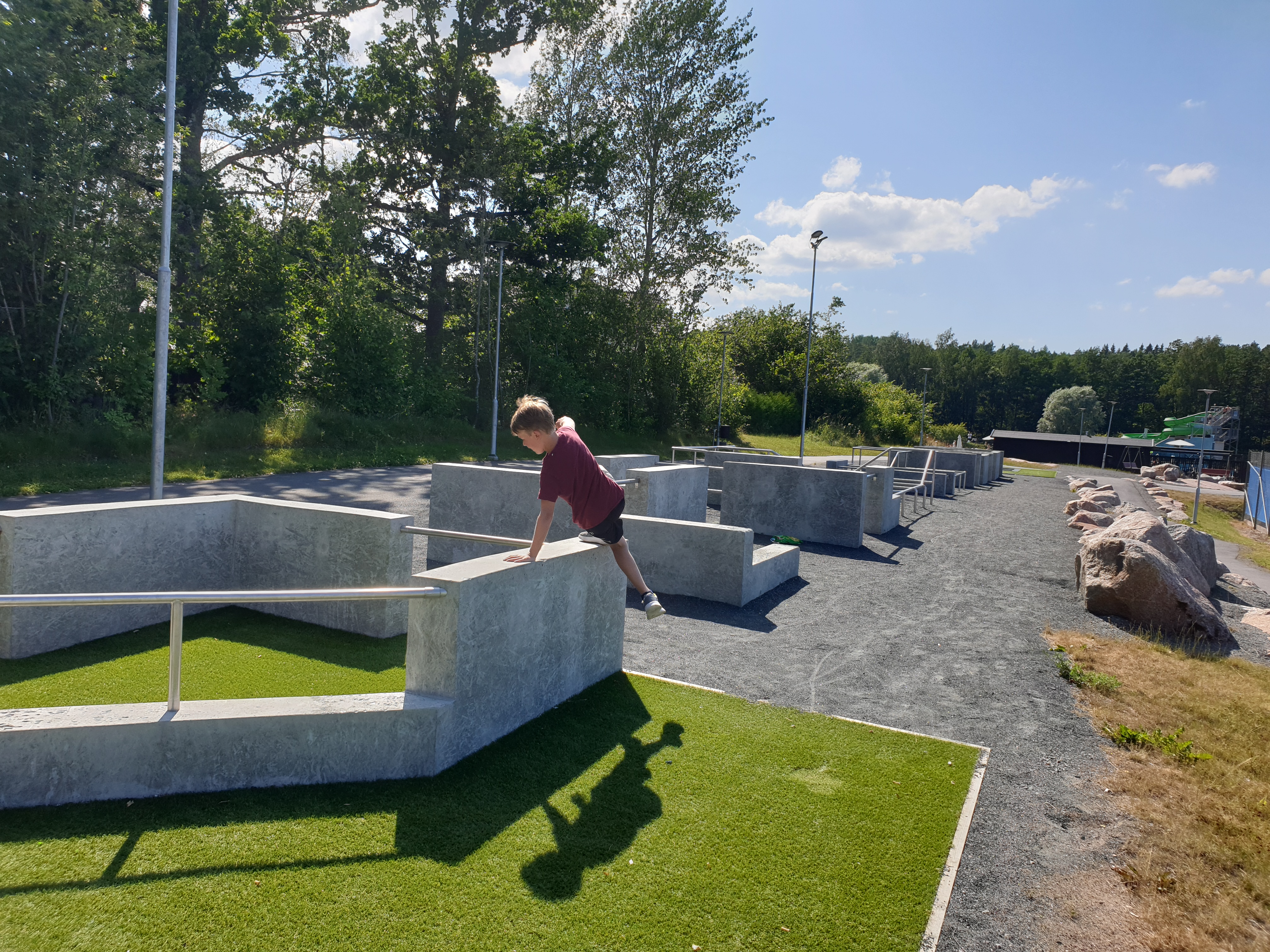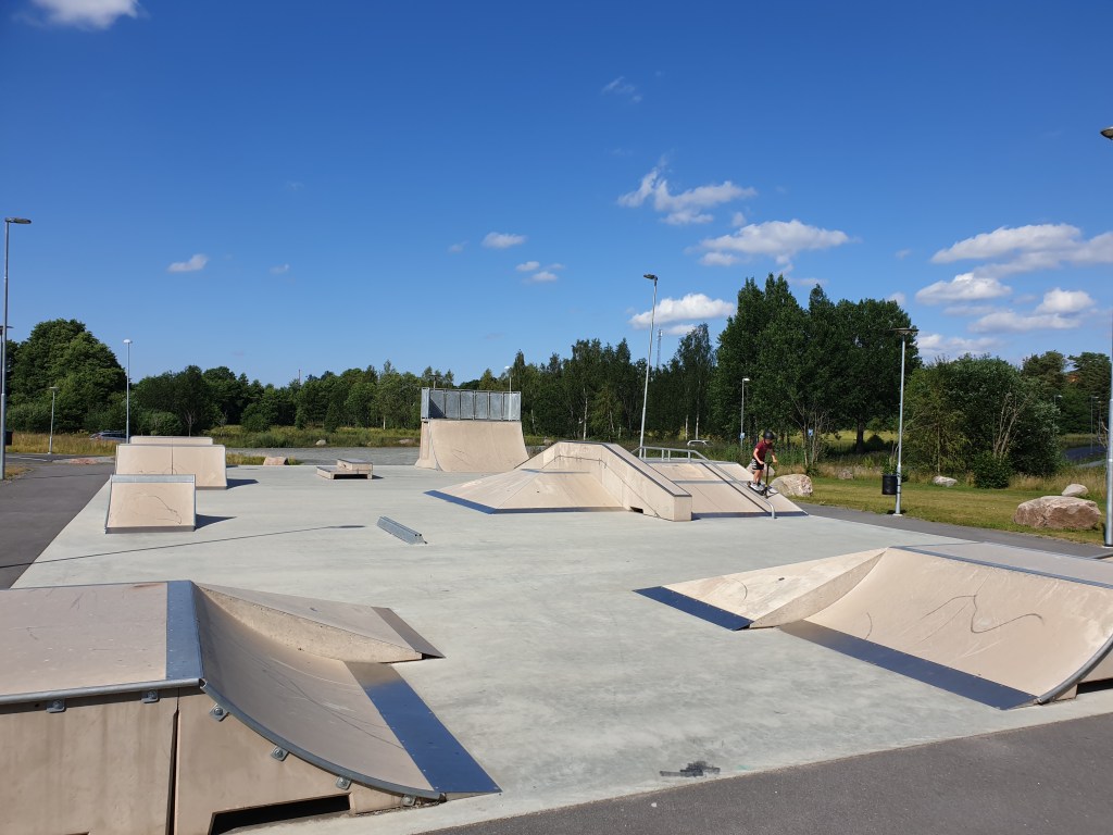 Lite utflykt från sommarhuset till 27grader varm pool, vattenrutschbana, skatepark och en parkourpark. Barnen har haft kul och alla har badat och Morgan har kört både parkour och lite kickbike. En härlig dag helt enkelt.